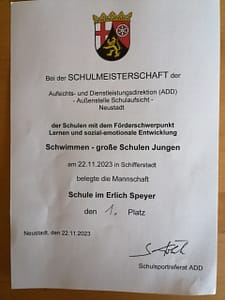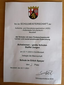 Mit insgesamt 15 Medaillen ist unser Schwimmteam von den diesjährigen Schwimmmeisterschaften zurück gekehrt. Neben diversen Einzelmedaillen in fast allen Disziplinen haben unsere Jungs auch die Silbermedaille bei der Staffel und letztlich auch bei sieben teilnehmenden Förderschulen die Goldmedaille als erfolgreichste Schule bekommen.