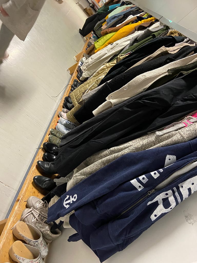 Schon in den vergangenen Wochen hat das Helferteam rund um den Kleidermarkt einmal wöchentlich vorsortiert und die gespendeten Klamotten gesichtet, so dass es heute nur noch darum ging, die Stapel auf den Tischen zu verteilen und an der langen Garderobe aufzuhängen!