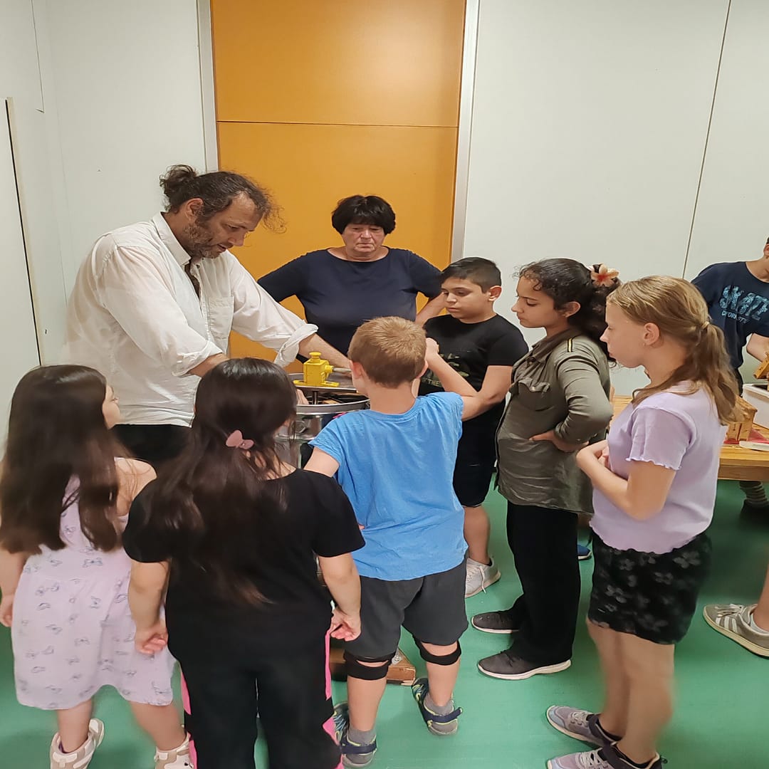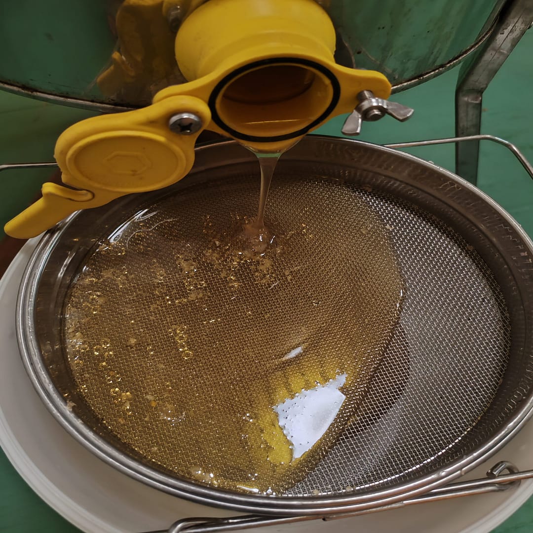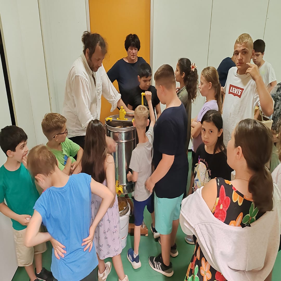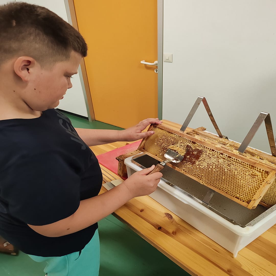 Am letzten Donnerstag 26.6. haben wir unseren Schulbienen die Honigwaben geklaut, entdeckelt und in der großen Handschleuder den neuen Schulhonig heraus geschleudert! Mit einem Sieb haben wir die Wachsreste herausgefiltert und das flüssige Gold in große Eimer abgefüllt. Nach den Ferien kommt er dann in die Gläser. Dieses Jahr gibt es leider nicht so viel Honig, weil unsere Bienenvölker durch die asiatische Hornisse ziemlich geschwächt sind. Deswegen werden wir ihn auch nur exklusiv auf der Weihnachtsfeier verkaufen. Nach den Ferien freuen wir uns auf ein paar neue interessierte Jungimker*innen in unserer AG! 🙂