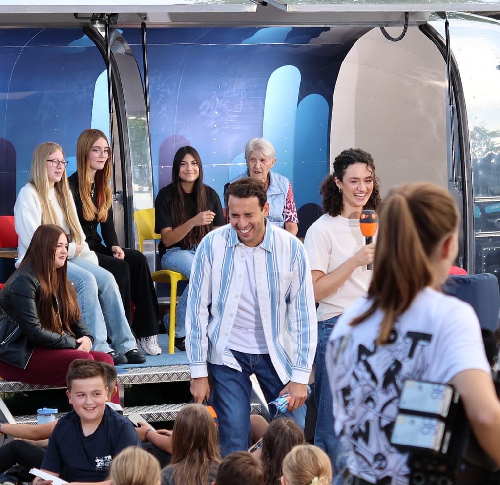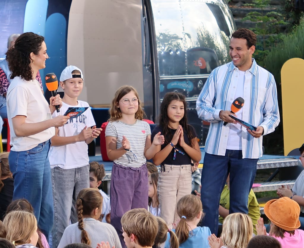 Das war eine Aufregung in der Schule im Erlich am 2.9.2025! Große LKWs, viele Kabel, eine Bühne und eine riesige Leinwand im Schulhof. Außerdem viele viele Kinder auf dem Spielplatz und rund um die Logo! Moderatoren Maral und Sherif auf dem Rasen. Nach dem Üben ging es los: Eine LIVE-Übertragung der Kindernachrichten im KIKA direkt aus Speyer, aus unserer Schule! Alle unsere Schülerinnen und Schüler waren da, alle Personen, die in der Schule im Erlich arbeiten und außerdem eine ganze Menge weiterer Gäste, die Karten für das Event ergattern konnten.