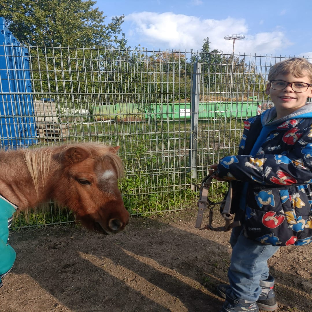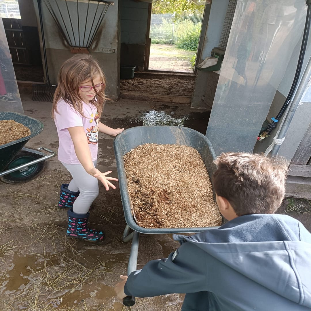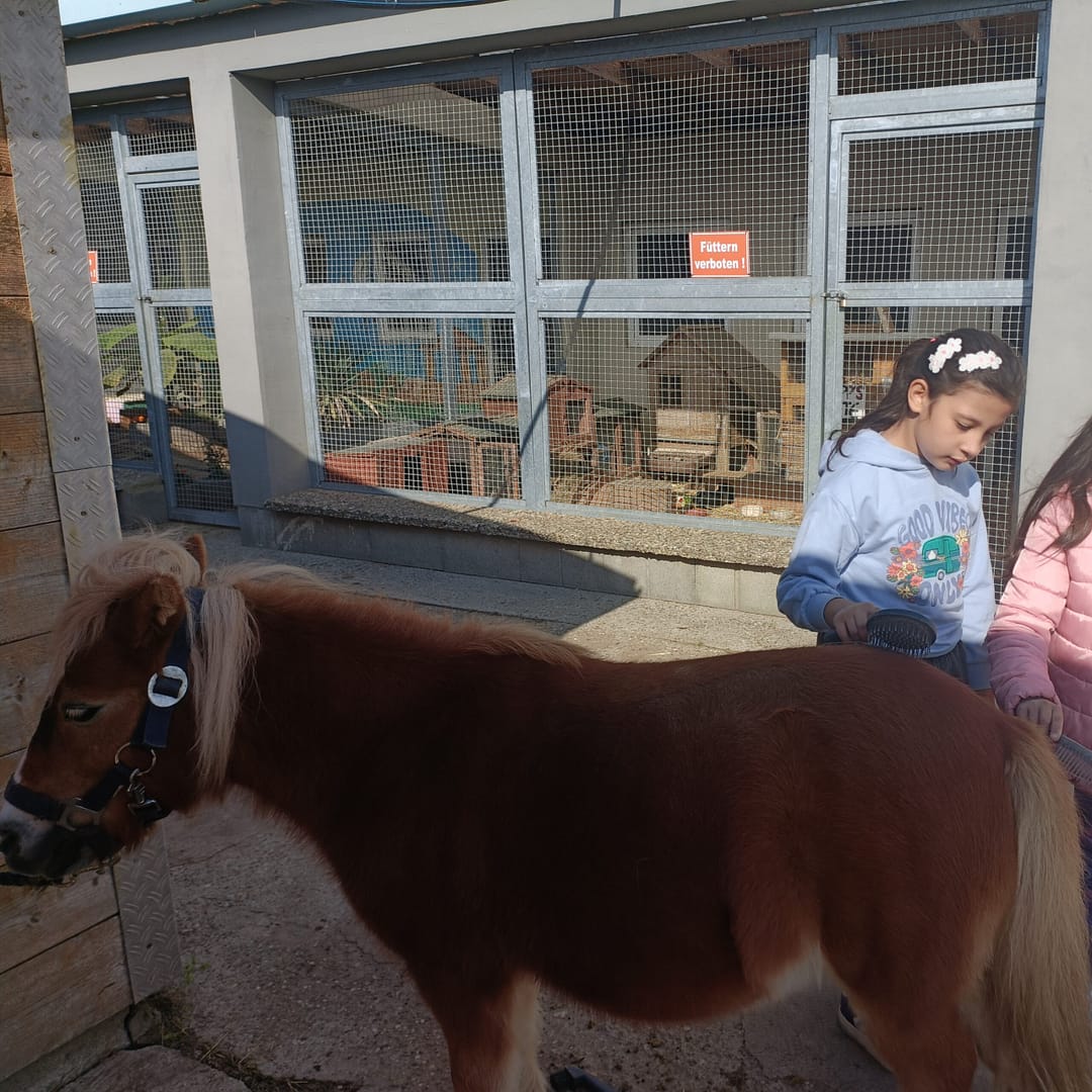 Am Donnerstag, den 24.09. und Mittwoch, den 1.10.2025, erkundeten Schülerinnen und Schüler der Unterstufe den Streichelzoo Rülzheim und halfen fleißig bei der Pflege der Tiere und des Geländes mit. Die Tiere wurden gestreichelt und gefüttert und die Ställe gemistet. Zum Ende des Vormittags bewegten die Kinder die Ponys auf dem Sandplatz, was für alle Beteiligten viel Spaß bedeutete. Die Schülerinnen und Schüler zeigten hierbei große Hilfsbereitschaft und Begeisterung im Umgang mit den Tieren. Besonders die Schildkröten und Shetland-Ponys sorgten für strahlende Augen. Schnell war der Beschluss gefasst: „Wir kommen wieder!“.