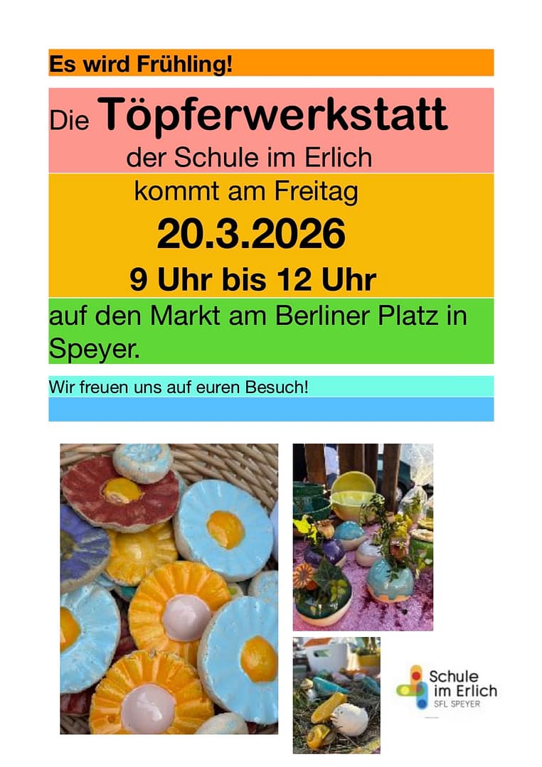 Am Freitag, den 20.3.2026 ab 9 Uhr wird die Töpfermanufaktur „TON in TON“ der Schule im Erlich ihre handgetöpferten Unikate zum Verkauf anbieten. Mit dem Stand auf dem Wochenmarkt am Berliner Platz in Speyer West präsentieren die SchülerInnen und Schülern der 9.Klasse ihre Arbeit und verkaufen ihre Kunststücke zugunsten des Fördervereins. Es gibt viele bunte Ostergeschenke, schöne Kleinigkeiten für den Haushalt und Deko für die Frühlingszeit!